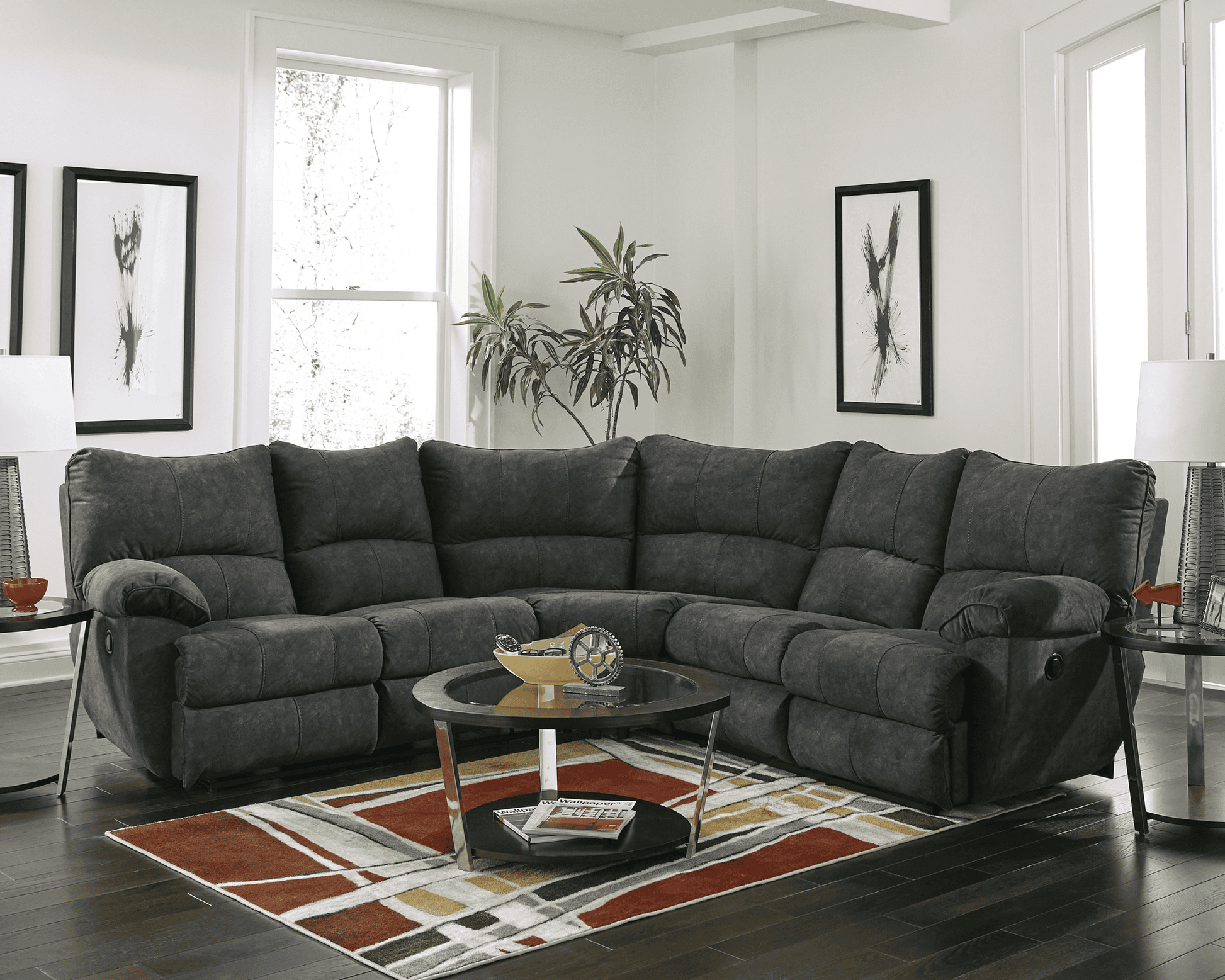 Microfiber 2 piece reclining sectional features microfiber covering throughout. Both ends recline to a full layflat position. Color is a dark charcoal