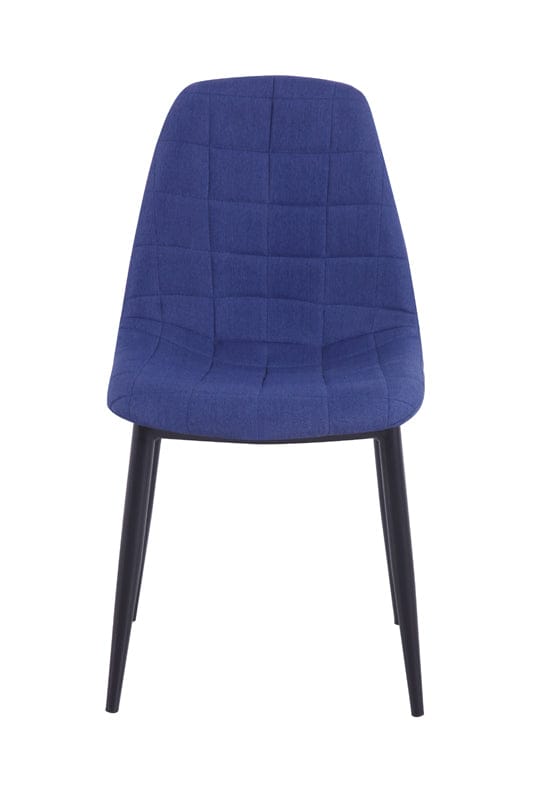 The Modrest Zella Modern Blue Dining Chair features a continuous back and seat design with rounded edges in blue fabric upholstery. It features equally distant stitches on the back and seat that serve as accent. Seamed edges prove its durability. This modern dining chair with a dimension of W18" x D24" x H34" and a seat height of 18" stands on black coated metal legs and requires no assembly.