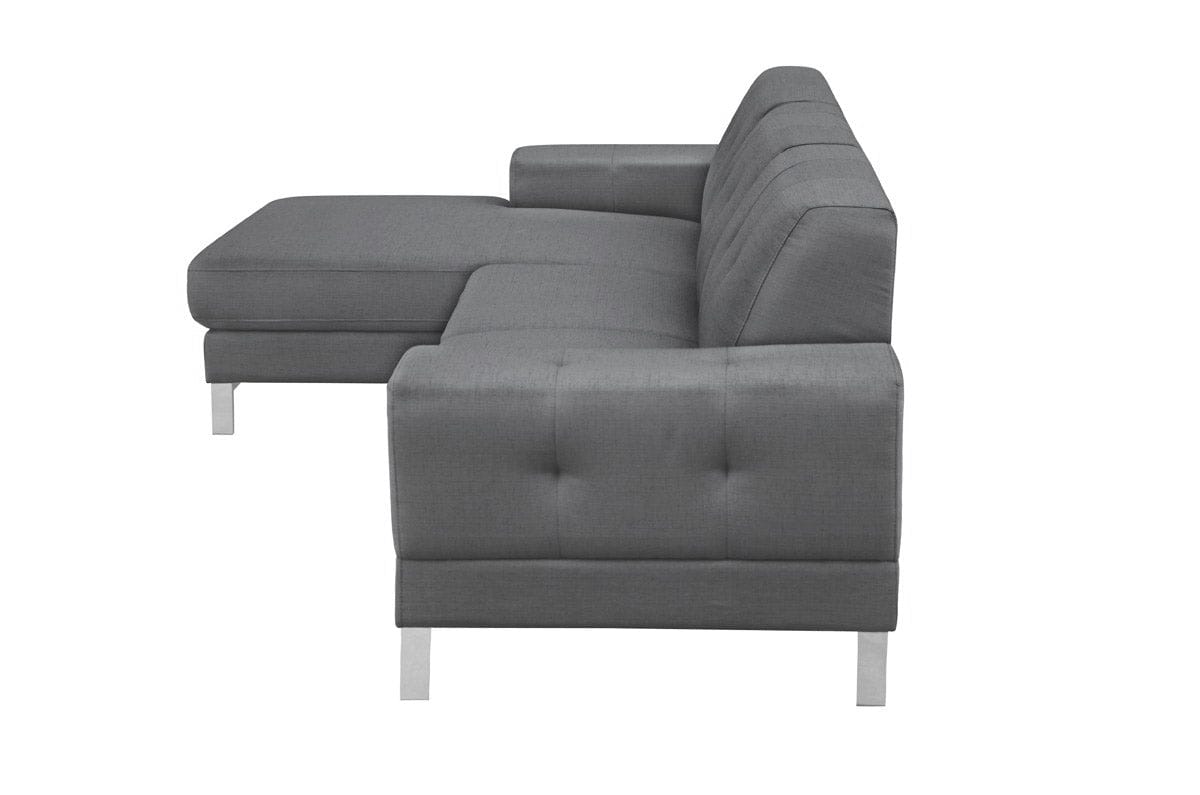 A spectacle of convenience and flair, the Divani Casa Forli Modern Grey Fabric Sectional Sofa with Left Facing Chaise harmonizes beautifully in any living room theme. Upholstered in 100% grey polyester fabric, it features a left facing chaise and flared armrests for utmost comfort. Stitched edges and lateral stitching stress the durability of this sectional sofa. Tufts on the linear stitches serve as accent. Matching the simple direct lines that frankly speak of its comfort and coziness are L-shaped metal legs.