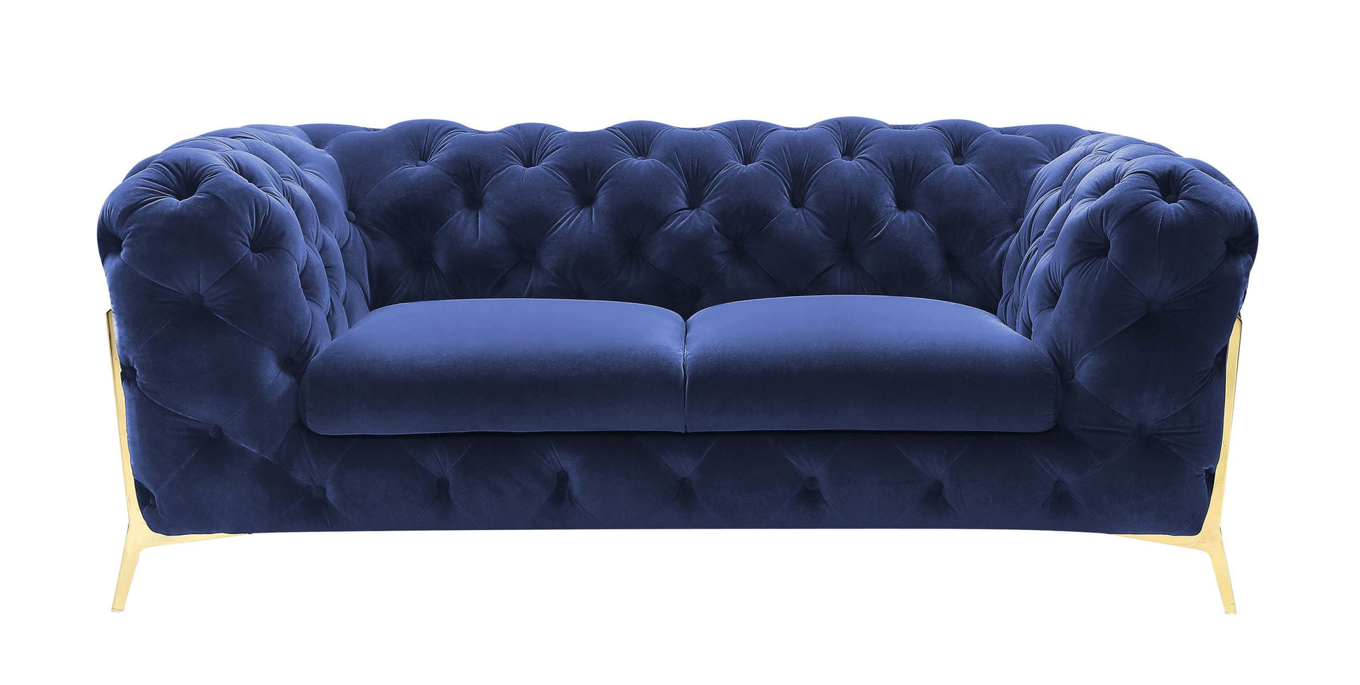The Sheila Blue Loveseat is a beautiful transitional, glam piece that can be used in different design settings; glam, transitional and contemporary. The loveseat is upholstered in blue velvet fabric, with overstuffed back and arms in a tuxedo style with diamond button tufting, and polished gold legs that extend upward creating a design feature of their own. Pair with the three seater sofa, and chair.