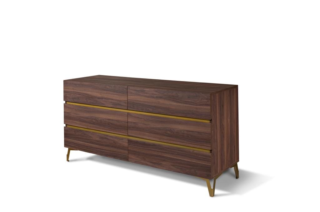 Exquisite lines mixed with a pragmatic design best describe the Nova Domus Calabria Modern Walnut & Green Velvet Bedroom Set. Featuring a lustrous matte Walnut laminate finish, this modern bedroom set dresses up your bedroom in fashion. Equipped with an extra-wide padded headboard upholstered in hunter green velvet, it allows you comfortable seating while reading. Pleats on the headboard further enhance its cushy feel. Completing this furniture set are two 2-drawer nightstands, a 6-drawer dresser, and a mirror. All furniture pieces feature striking wood lines in varying shades for that modern mid-century look. Gold metal drawer handles and angled legs lend a beautiful contrast to the sleek surface. Bring this modern walnut & green velvet bedroom set to achieve a voguish, functional bedroom.