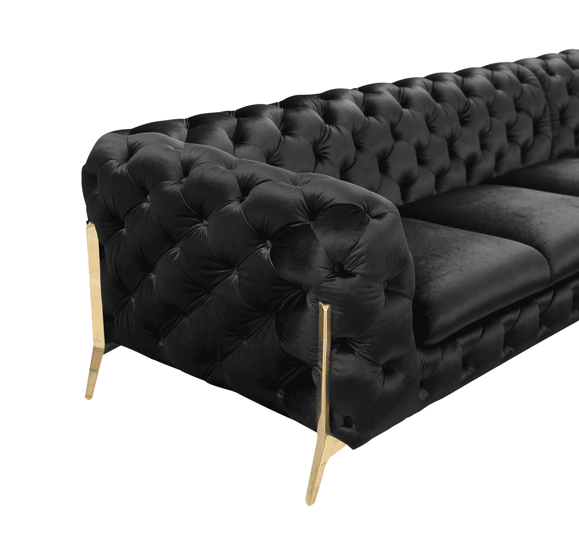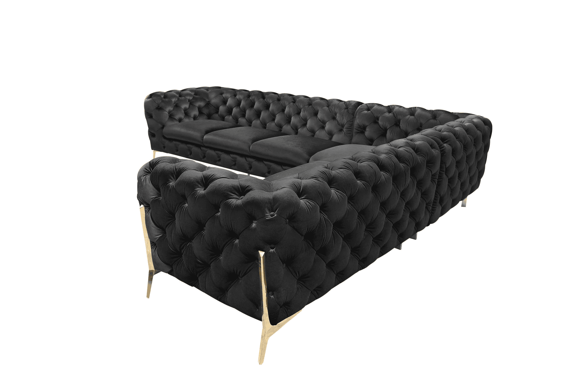 The sheila Black velvet sectional is a beautiful transitional, glam piece that can be used in different design settings; glam, transitional and contemporary. The sectional is upholstered in black velvet fabric, with an overstuffed back and arms in a tuxedo style with diamond button tufting, and polished gold legs that extend upward creating a design feature of their own.