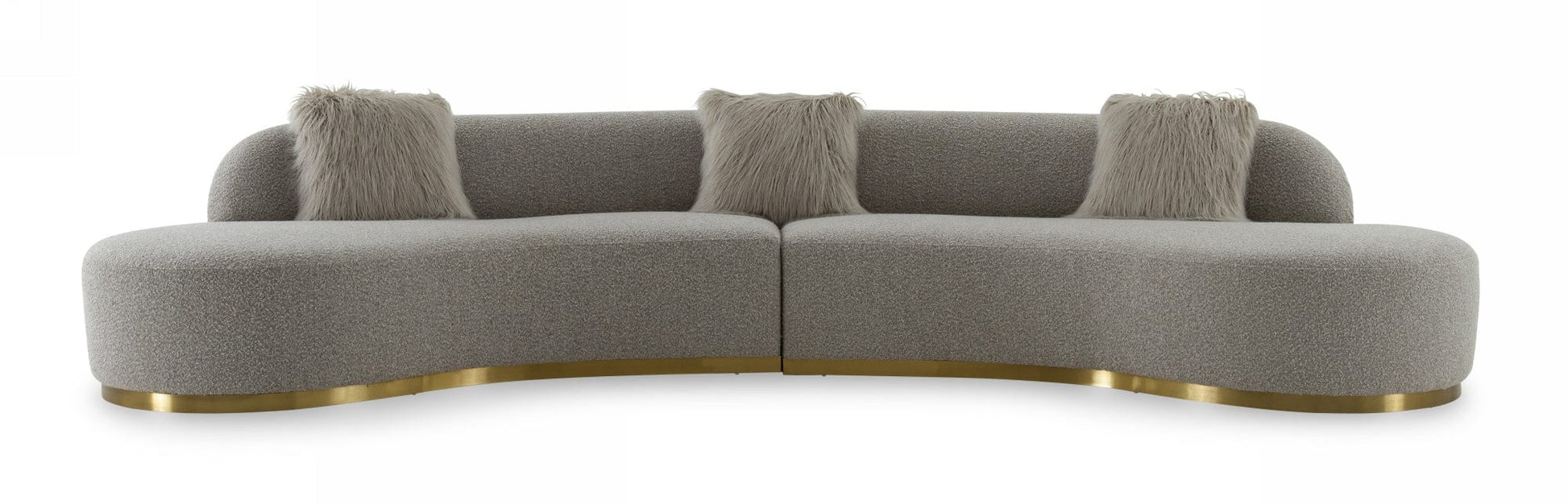 The Frontier Sectional is a stylish modern piece, perfect for a glam or contemporary home. make your home feel like an art gallery with this striking rounded sectional. The grey textured upholstery meets with the gold platform leg to create an enchnting contrast. An example of fine contemporary styles, this sofa is sure to become the star of any show.