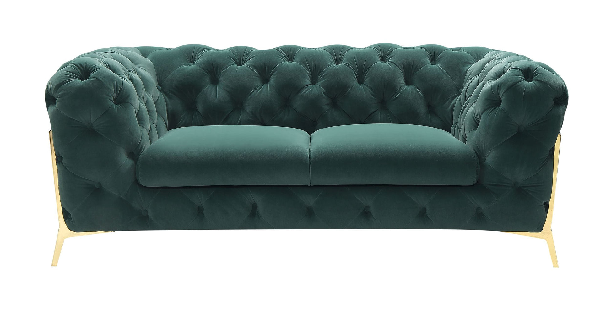 The Sheila Green Loveseat is a beautiful transitional, glam piece that can be used in different design settings; glam, transitional and contemporary. The loveseat is upholstered in green velvet fabric, with overstuffed back and arms in a tuxedo style with diamond button tufting, and polished gold legs that extend upward creating a design feature of their own. Pair with the three seater sofa, and chair.