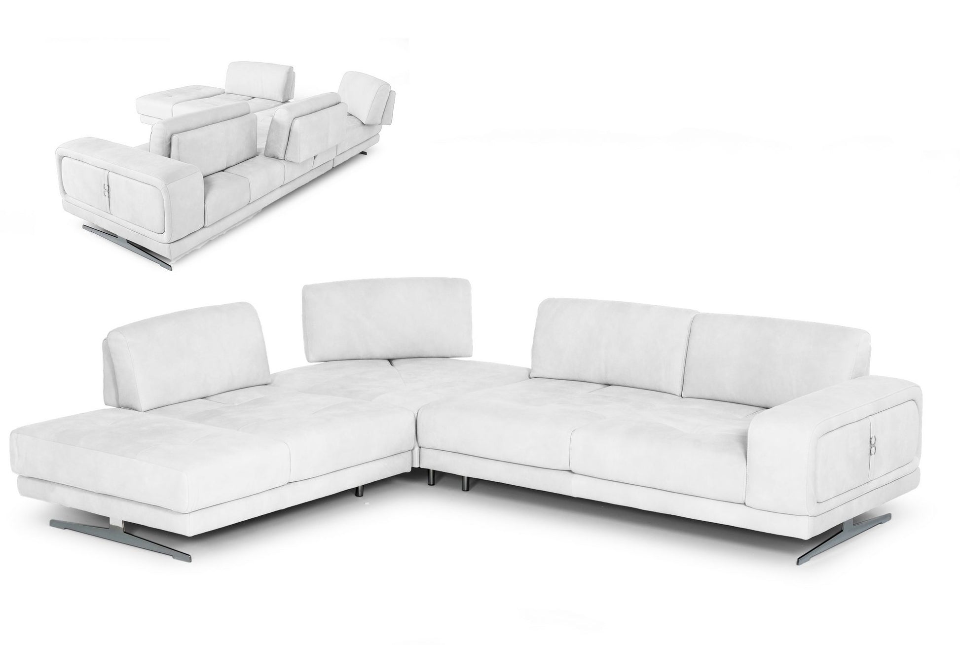 The Mood Sectional is a beautiful Italian-made marvel. Coronelli Collezioni continues to bring us exquisite pieces and the Mood is no exception. The high-grade top-grain upholstery looks stunning in the white nirvana coloring while stainless steel legs offer contemporary necessities. Moveable backrests make this piece as functional as it is stylish. Pair with a patterned rug and stainless steel coffee table.