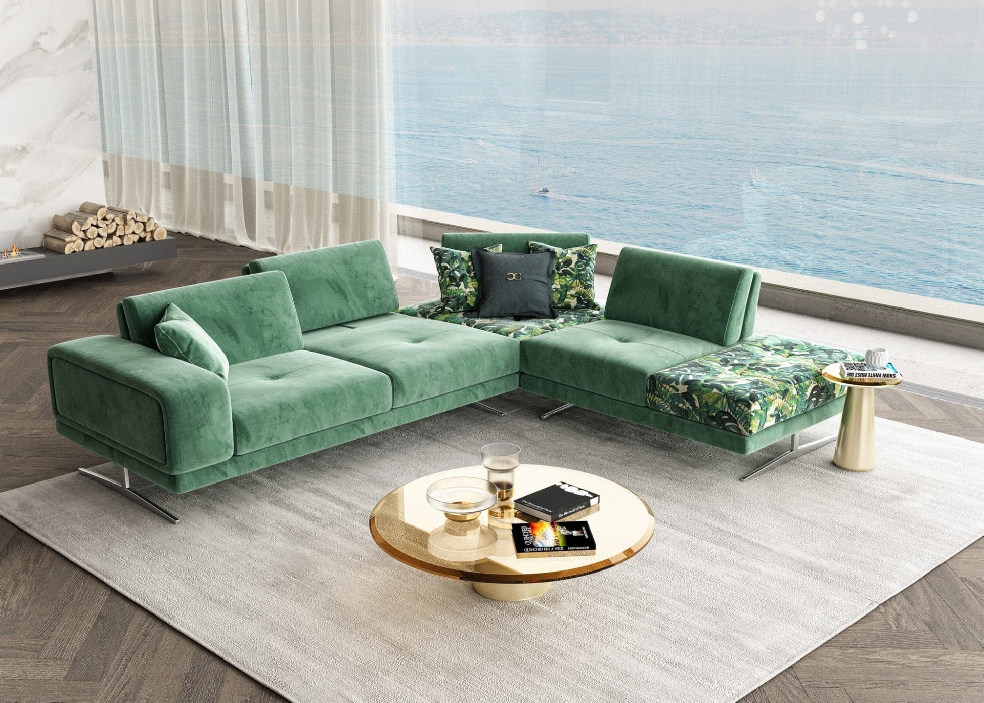 The Mood Sectional is a beautiful Italian-made marvel. Coronelli Collezioni continues to bring us exquisite pieces and the Mood is no exception. The velvet upholstery looks stunning in the green and patterned coloring while stainless steel legs offer contemporary necessities. Moveable backrests make this piece as functional as it is stylish. Pair with a patterned rug and stainless steel coffee table.