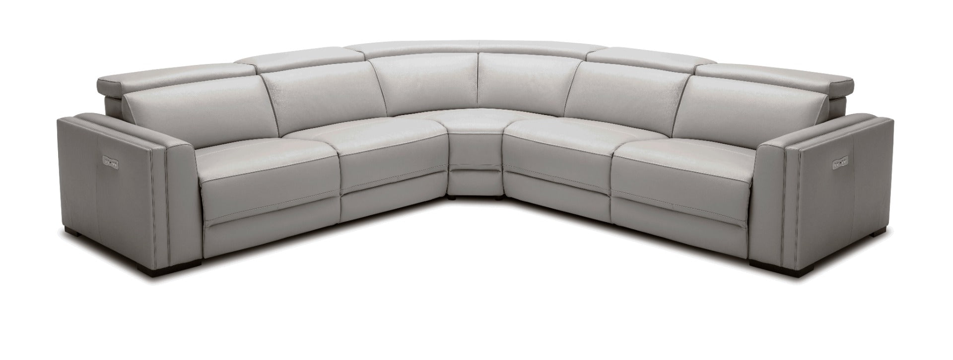 This five-piece sectional redefines luxury with its contemporary lines and roomy seats. The oversized cushions provide a minimalist design in an unfussy fashion. The combination of comfortable foam supported by springs and smooth top grain leather tempts you to recline. On either side, a pair of power motion recliners provide great places to unwind and offer customizable comfort. The console offers cupholders and built-in storage that makes it possible to keep remote controls, magazines, and cold drinks within arms reach. The Modrest Frazier is a fantastic sectional for adding modern charm and comfort convenience to your living room. Avaliable in both white and grey leather colorways.