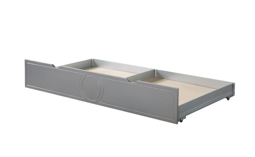 Add some smart ideas and bright accents to your child's bedroom with the Powell Trundle. In a glimmering silver finish and wooden carving details on the frame of trundle create a brilliant look into any bedroom. The function and design of this bed are elevated; it can be placed underneath a daybed and roll out it when required. The trundle includes slats offering a support foundation for your mattress.