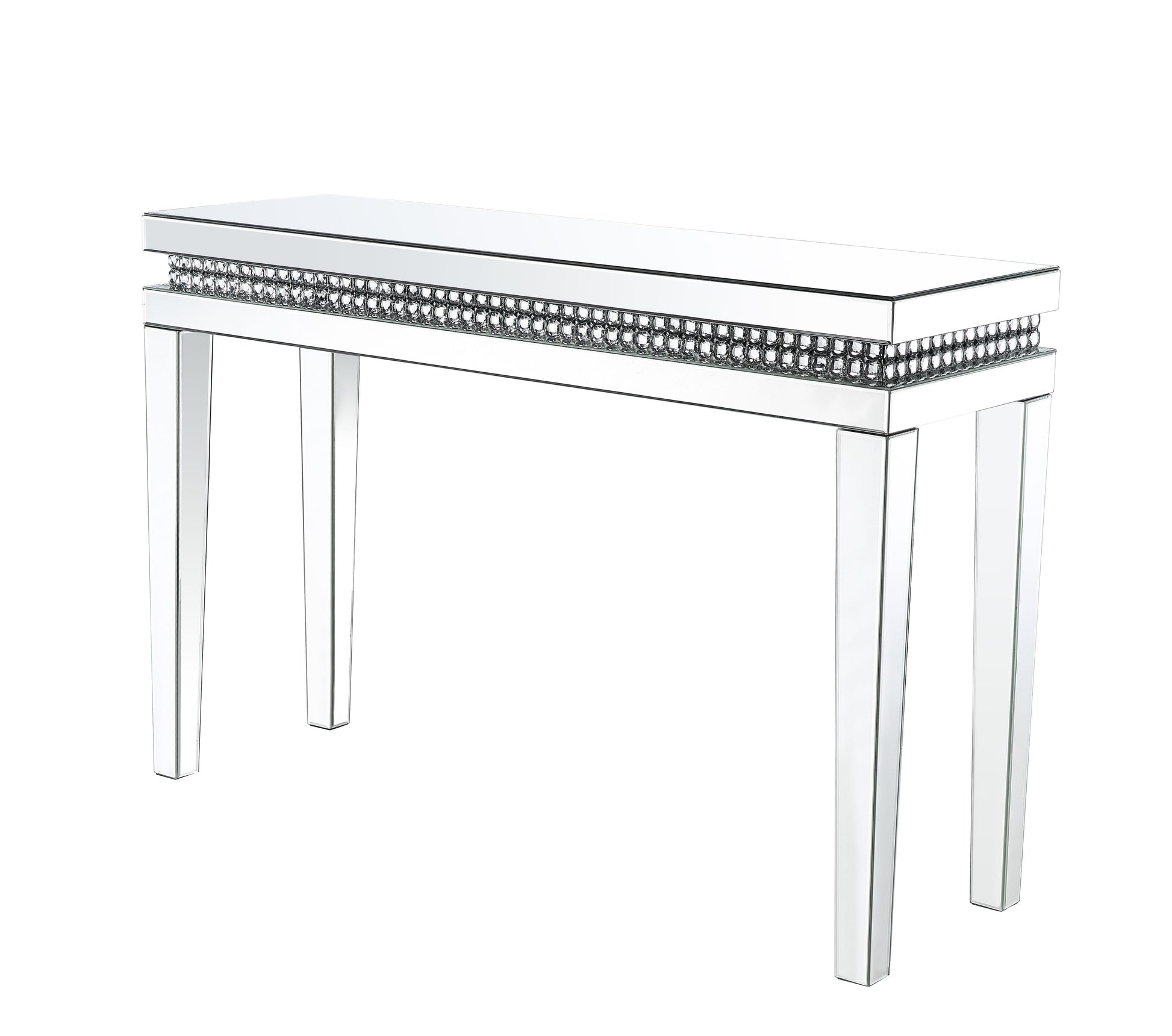 Shining in the Hollywood glamour style, the Lotus Sofa Table will be an ultimate statement piece for your dreamy living room. This mirrored furniture features reflective surface for a multi-layered look, with decorative faux crystals enhancing its modern and glamorous design. This fabulously glam sofa table reflects your sense of style, adding depth and shine to your living space.