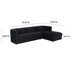 Description: Graceful and eye-catching, the Callie Sectional is the epitome of modern glamour. Its curved silhouette, scalloped tufted back and beautiful stainless steel legs, add character and style to any room. Available in multiple color options.