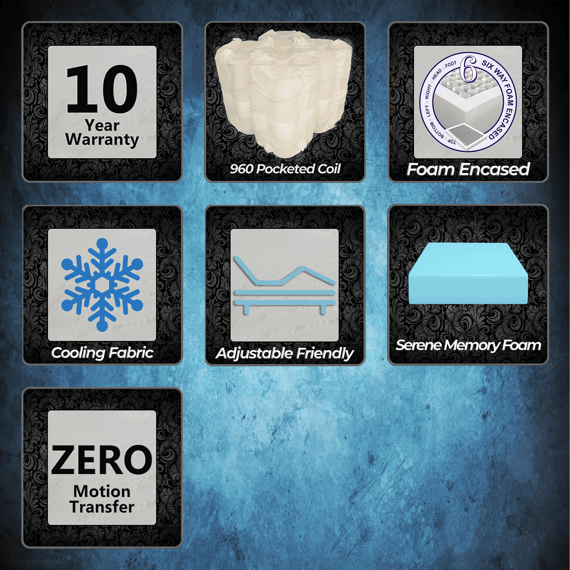 The Cooltex Hybrid Eurtop is an upgraded version of our top selling Venice Collection. First, it features our heavy duty 960 pocketed coil unit, which is the most durable pocketed coil unit on the market. It also features patented Carpenter Serene Foam, which is a major upgrade from traditional memory foam. Serene foam doesn't retain heat, nor does it give you that sinking feeling like memory foam. It also doesn't get hard when it gets cold. It's consistent on and off your floor.