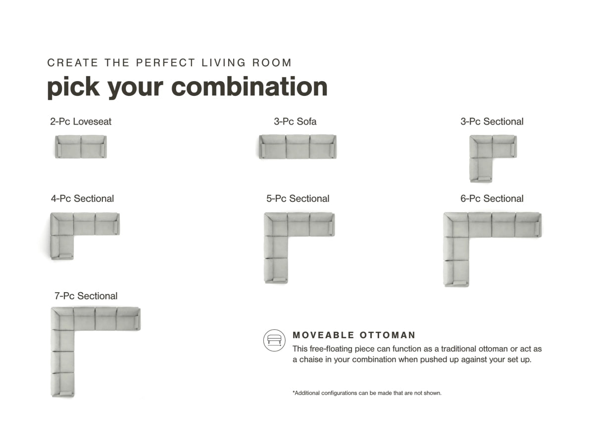 Modular pieces can float anywhere; sides are finished (with no connectors)
