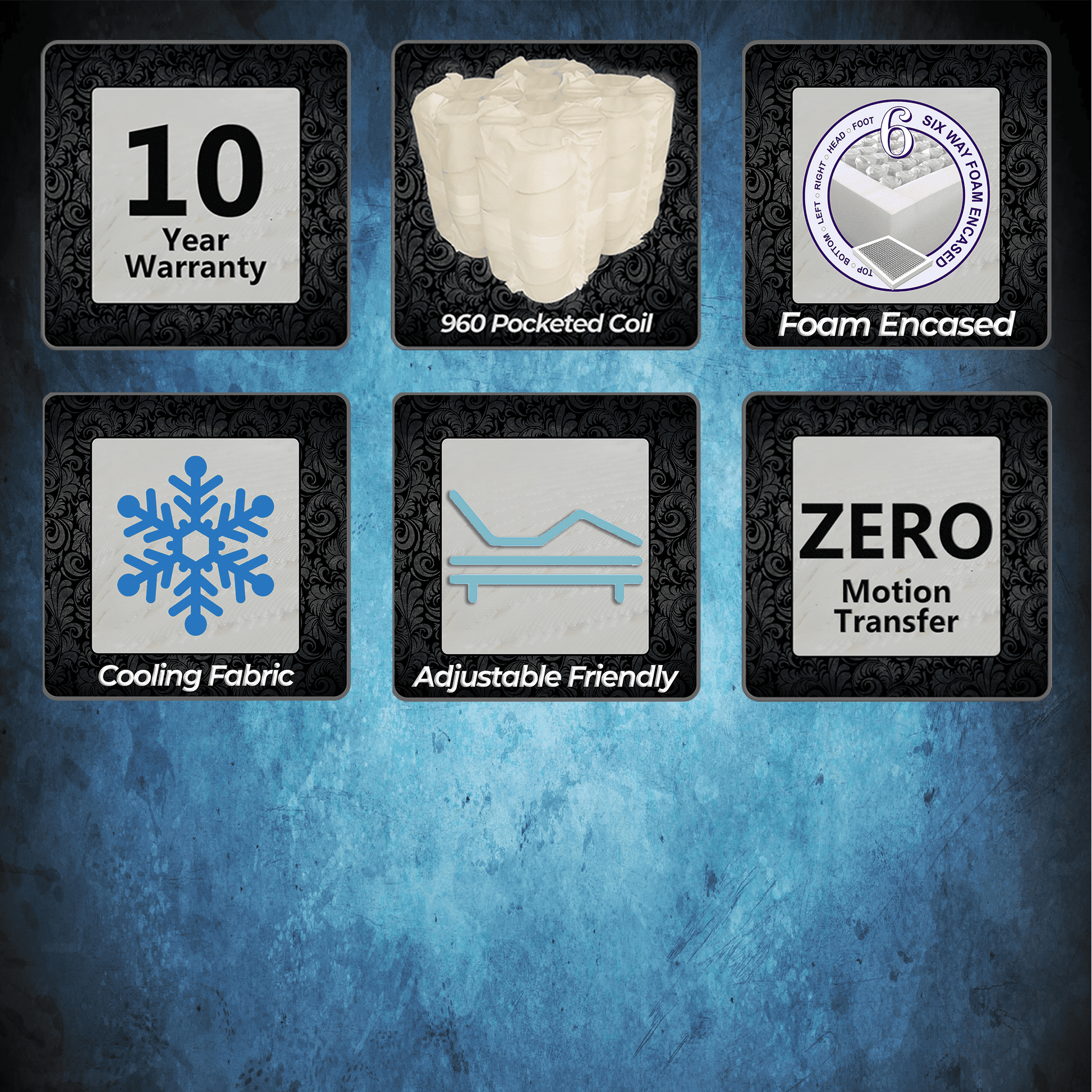 The Energie features our highly durable 960 pocketed coil from Texas Pocket Coil. This mattress has a medium feel. The Burberry border attracts deserved attention. This bed is foam encased while having our patent pending Cool Silk Fabric cover. Cool Silk Fabric is 40% cooler than traditional fabric. This fabric is cool to the touch and is a noticeable upgrade from traditional fabrics.
