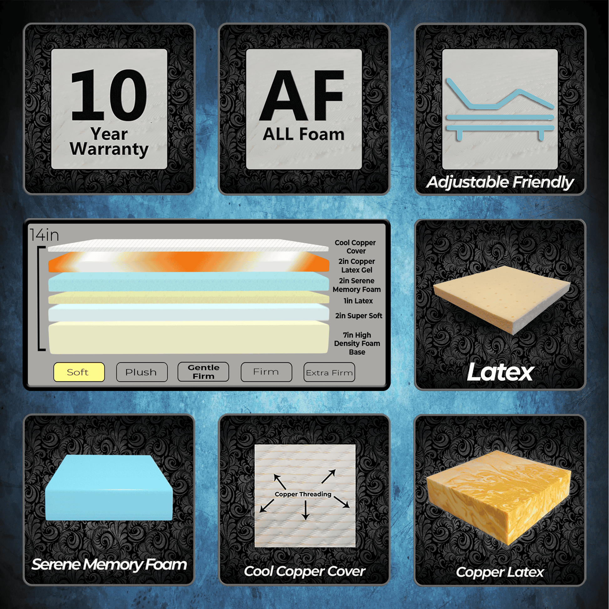 This is the most thick all foam mattress we manufacture. The Gel Tex features all of the best foams including copper foam, which both wicks heat away from the body and kills 99% of bacteria and fungus and Carpenter Serene foam which doesn't retain heat, dip or sink like traditional memory foam. This mattress is rated as soft.