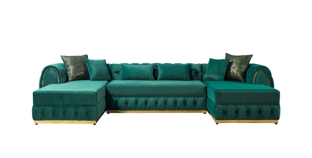 Experience ultimate relaxation and luxurious style with the remarkable Jess Double Chaise Sectional. Every inch of this sectional is carefully designed with premium velvet upholstery. Each arm comes with a unique gold-colored brooch that symbolizes exclusivity and sophistication. The glistening gold details on arms and bottom elevate the sectional's aesthetic appeal and provides a glamour. Whether you're indulging in a good book, entertaining guests, or seeking a serene moment of tranquility, the Jess sectional guarantees unparalleled seating satisfaction. The sectional comes with six pillows.