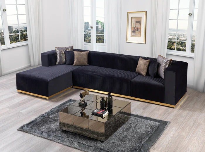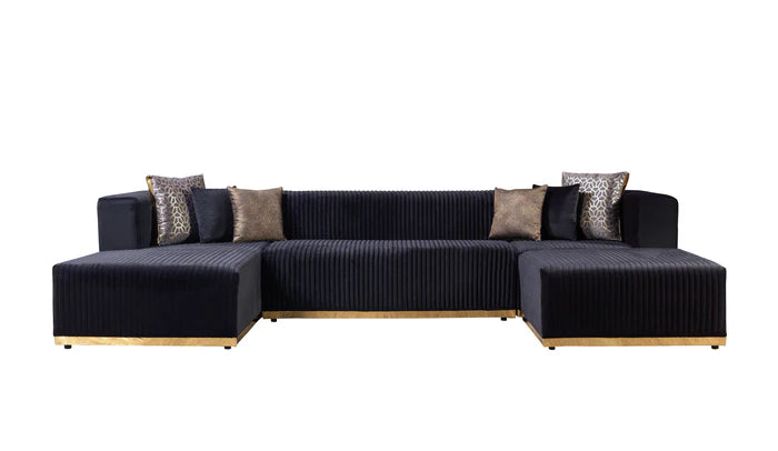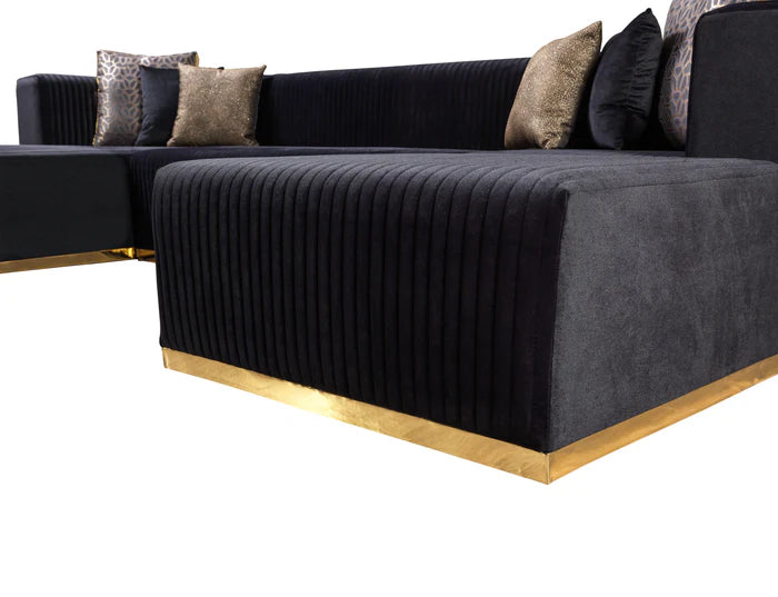 The Juliana features vertical channel tufting, adding a touch of visual intrigue and depth. This tufting technique not only enhances the sectional's aesthetic appeal but also provides a luxurious texture that you'll love sinking into. The golden finish adds a glow to your space. The item comes with six designer pillows.