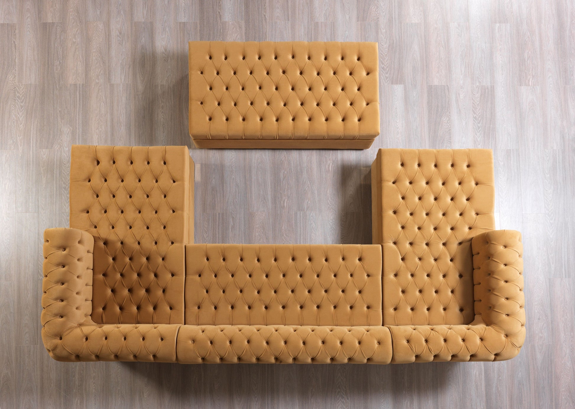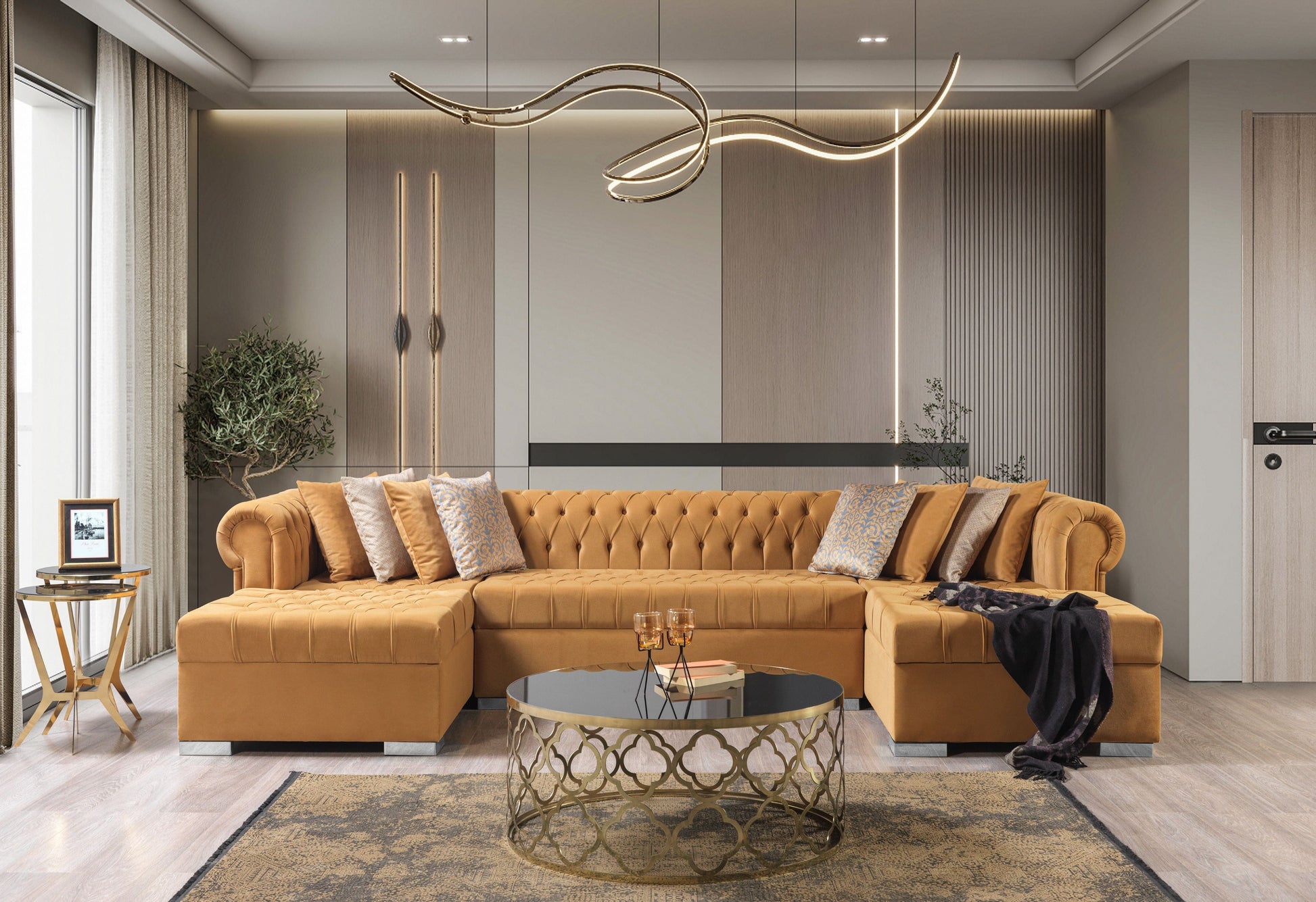 Lauren is our most charming, luxury double chaise sectional boasting a fusion of contemporary and classic style. This sectional comes with complete sets of gold legs and eight designer pillows.