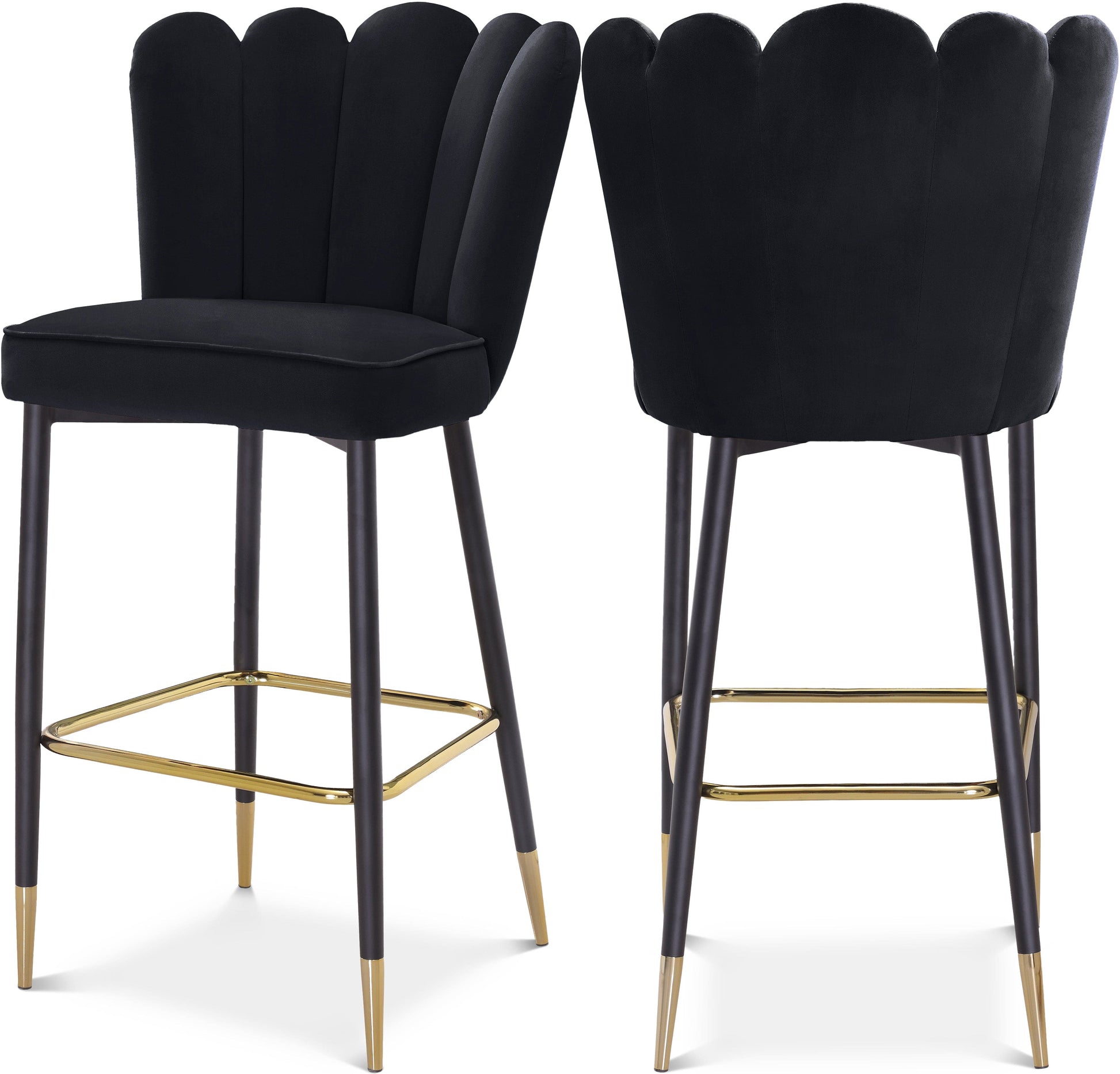 Fall fast and hard for the beautiful look of this Lily Bar Stool from Meridian Furniture. This lovely stool features a striking pink velvet fan-style back with deep tufting that helps the padding inside stay full and aloft for added comfort. The cushioned seat and back are upholstered to the hilt for maximum luxury and beauty. Black metal legs with a matte finish and gold tips add contemporary appeal to this handsome stool whether used at the bar or kitchen counter.