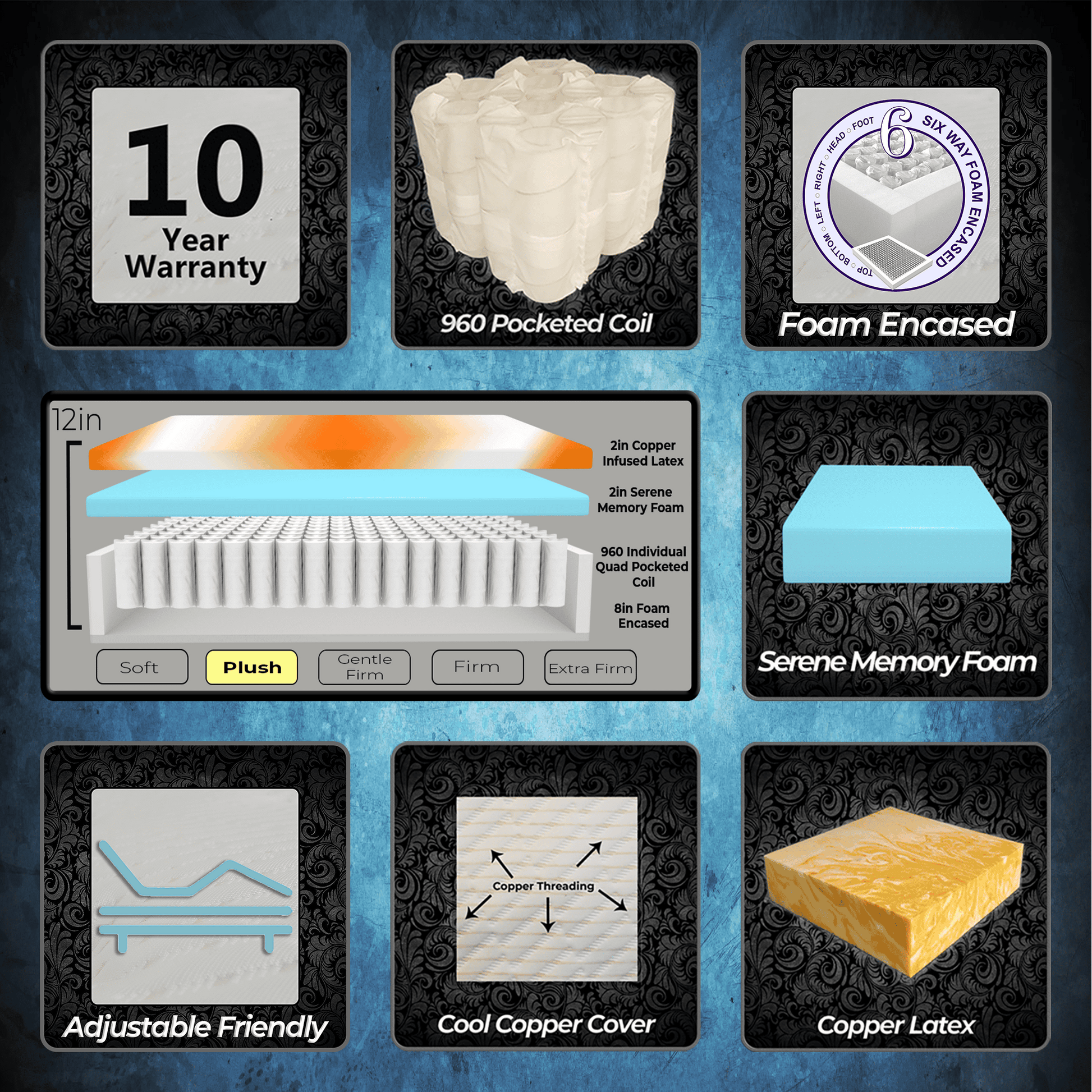 The Copper Luxe 1 features hybrid engineering with the latest in copper infused latex foam and carpenter serene foam. It bolsters an extremely durable pocketed coil spring unit with advanced zero motion transfer technology, created to ensure proper spinal alignment for the ultimate sleep experience. This ultra-comfortable mattress intuitively adapts to your unique body shape and sleep style while keeping you cool with our all new Cool Silk Cover. The Copper Luxe 1 works on both adjustable bases and traditional bed frames and comes with a 10 year, best in the industry, manufacturer warranty. Sleep cooler, longer and fall asleep faster with the new Copper Luxe I.