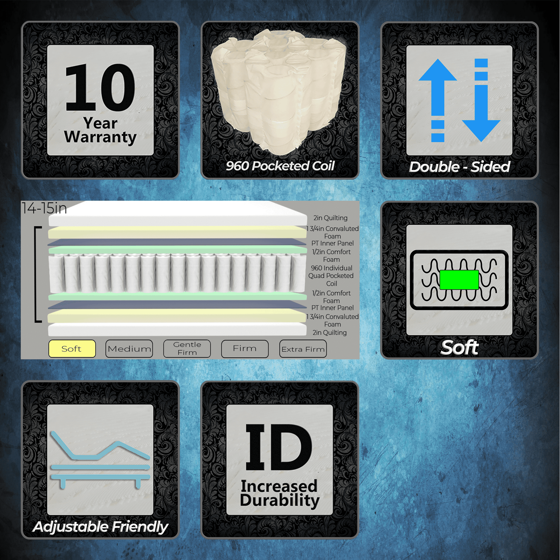 The Siena Hybrid Pillowtop is our thickest mattress that we make. It is a double-sided, pocket coil and pillowtop mattress with a luxurious 480g cover on both sides. This has a nice Medium feel. If you're looking for a thick Pillowtop mattress, this is the one. Get twice the longevity, for a half the price. Its durable, comfortable and doesn't break the bank. We have special pricing for twin XLs for adjustable beds.