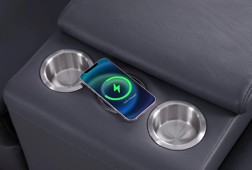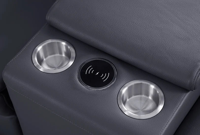 Introducing the exquisite Picasso Sectional in a refreshing Dark Grey hue, a testament to modern Contemporary Style. Crafted with meticulous attention to detail, this sectional features a harmonious blend of luxury and functionality. The Leather Match upholstery offers a perfect balance between opulence and practicality. Equipped with two Power Recliners and two Power Headrests, this sectional ensures personalized comfort at your fingertips. The thoughtfully designed Console comes with convenient Cupholders, allowing you to relish your favorite beverages while lounging. To keep you connected, a built-in Wireless Charger ensures your devices stay powered without interruption. Elevate your living space with the Picasso Sectional, where sophistication and innovation converge seamlessly.