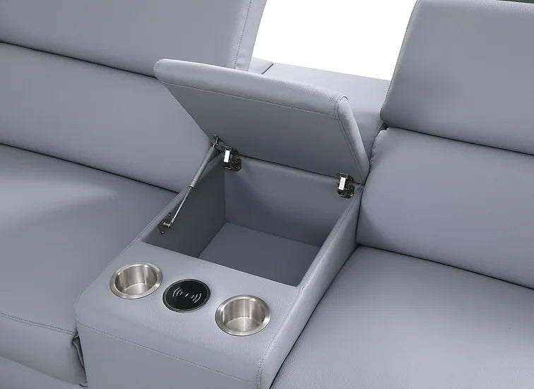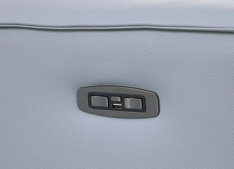 Introducing the exquisite Picasso Sectional in a refreshing Light Blue hue, a testament to modern Contemporary Style. Crafted with meticulous attention to detail, this sectional features a harmonious blend of luxury and functionality. The Leather Match upholstery offers a perfect balance between opulence and practicality. Equipped with three Power Recliners and two Power Headrests, this sectional ensures personalized comfort at your fingertips. The thoughtfully designed Console comes with convenient Cupholders, allowing you to relish your favorite beverages while lounging. To keep you connected, a built-in Wireless Charger ensures your devices stay powered without interruption. Elevate your living space with the Picasso Sectional, where sophistication and innovation converge seamlessly.
