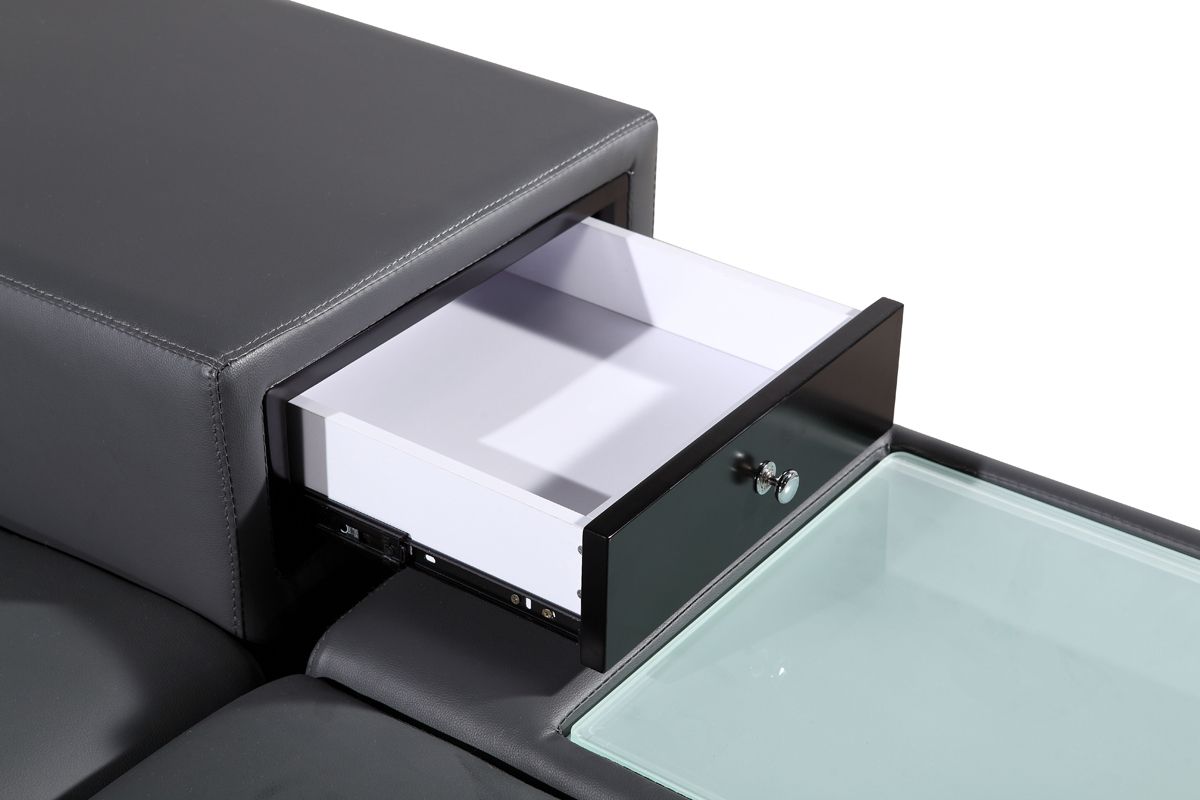 It features one light on the chaise with a storage compartment right above it (pictured on the right). It features another light on the side with a shelf to store things. This extravagant luxury sofa is upholstered in bonded leather in the front where your body touches, such as the top armrests, the bottom cushion, the back rest, and the head rests. It has a leather match PVC material in other areas to help keep costs down but is an indistinguishable match to the bonded leather portion. The cushions of this sofa are very soft and comfortable to lay on. The Polaris may also be ordered in different colors and also in Italian Leather upholstery by contacting our customer service. Approximate lead time for this black sofa and other special order colors are normally 8-12 weeks.