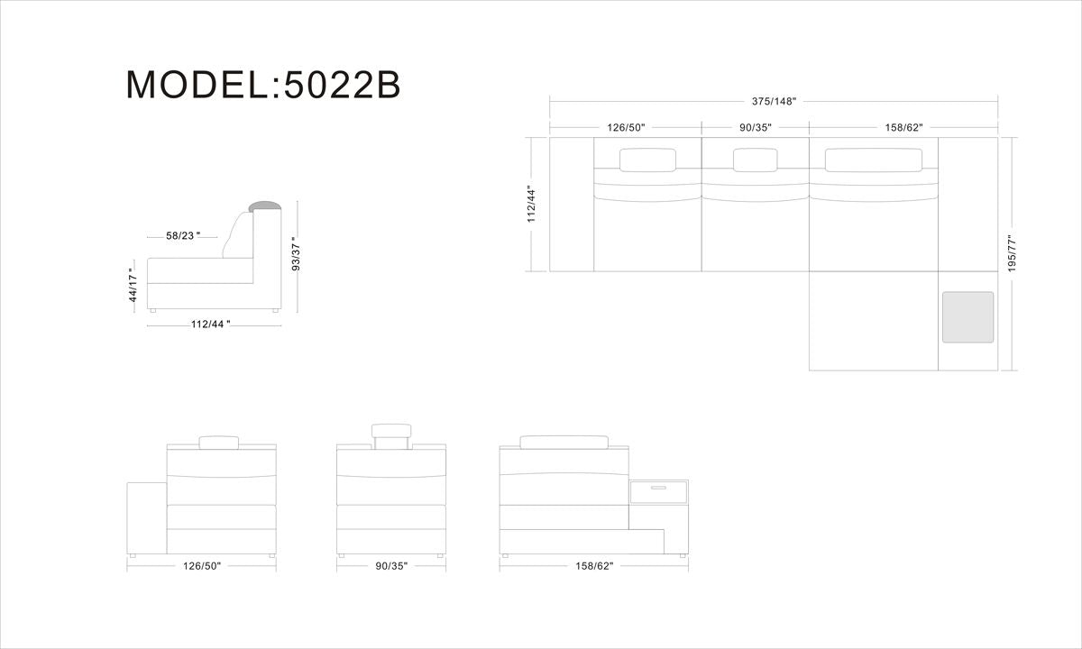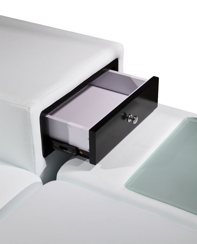 It features one light on the chaise with a storage compartment right above it (pictured on the right). It features another light on the side with a shelf to store things. This extravagant luxury sofa is upholstered in bonded leather in the front where your body touches, such as the top armrests, the bottom cushion, the back rest, and the head rests. It has a leather match PVC material in other areas to help keep costs down but is an indistinguishable match to the bonded leather portion. The cushions of this sofa are very soft and comfortable to lay on. The Polaris may also be ordered in different colors and also in Italian Leather upholstery by contacting our customer service. Approximate lead time for this black sofa and other special order colors are normally 8-12 weeks.