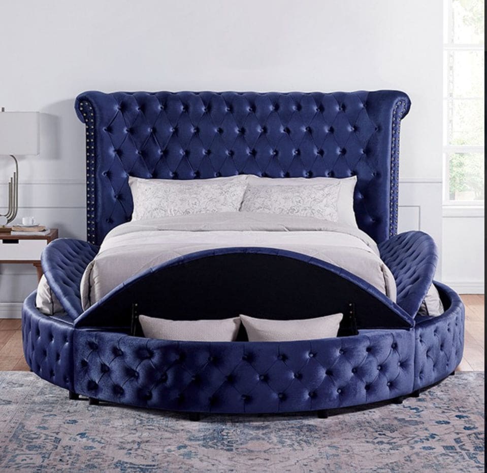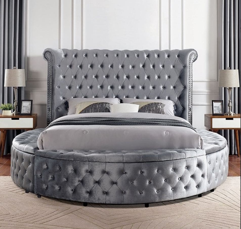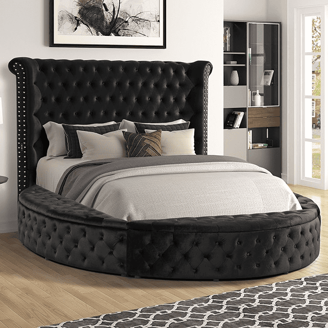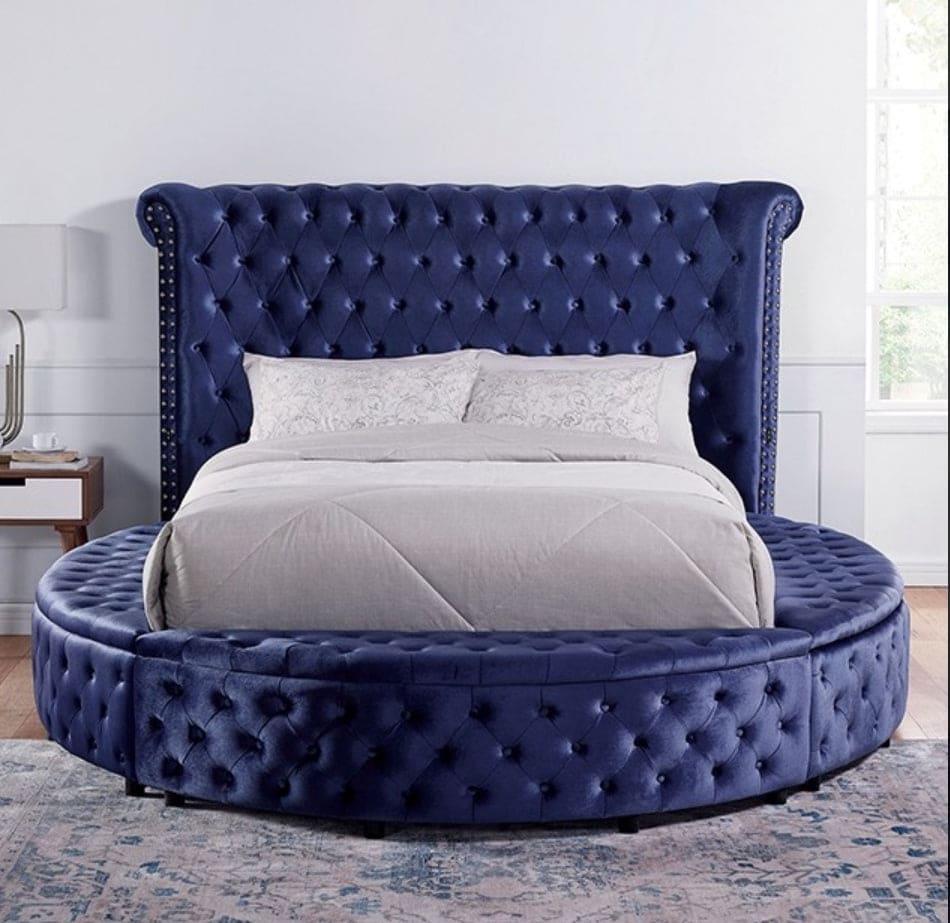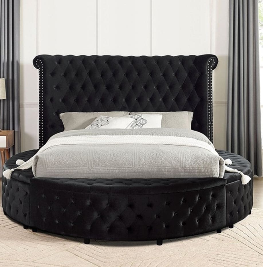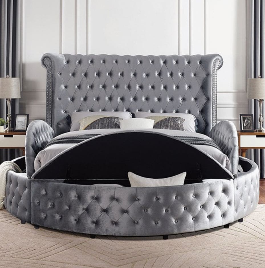 There's something special about a round bed, and this piece certainly exudes that air of glamour. It is upholstered in velvet-like fabric and tufted all around with acrylic crystals. The stylish wingback headboard with nailheads curls up top into a chesterfield-inspired design. Then there's the USB port present on each side of the headboard to keep your electronics charged up. Just imagine yourself opening a door and being greeted by this sultry--and surprisingly tech-forward--masterpiece.