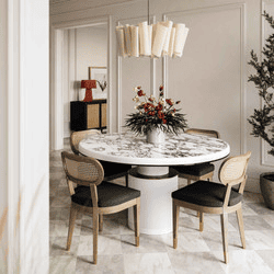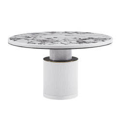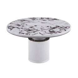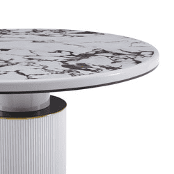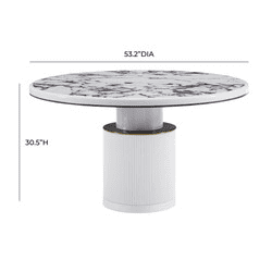 Description: Simple and modern meets glam style with the Vanessa White Marble Lacquer Round Dining Table! Handcrafted to perfection, this table is the perfect certpiece in your dining space. The round, ribbed base features beautiful gold and black detailing topped with an elegant and durable faux marble table top.