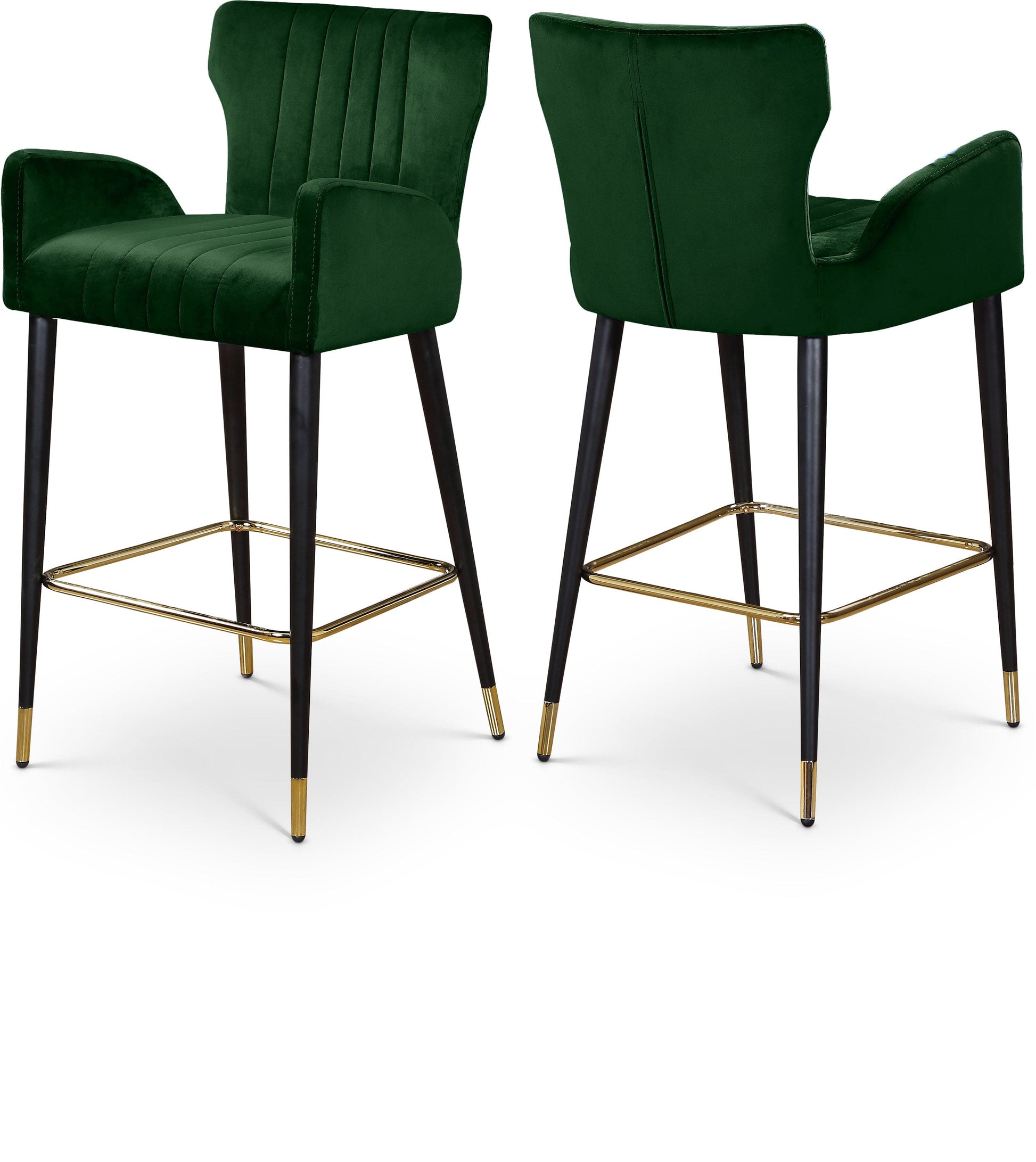 Inject beautiful color into your counter or home bar area with the Luxe Green Velvet Stool. Flared sides and a semi-high back provide support while you sit, so you stay comfortable for the whole meal. Channel tufting on the seat and back adds a dimensional effect while helping the padded cushions keep their loft and form. The metal legs are given a black finish for a contemporary look and goldtone hardware tips for a regal finish.